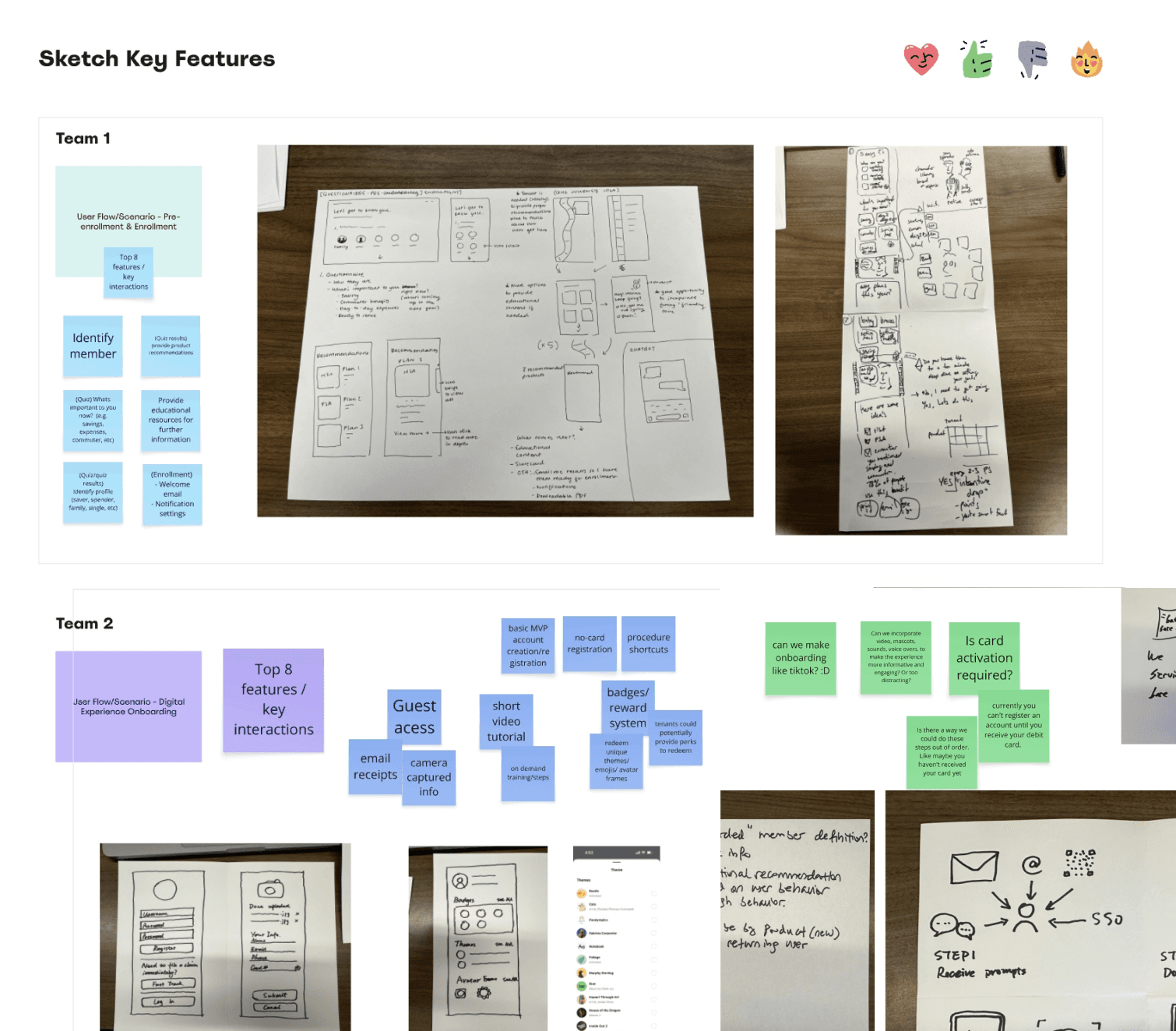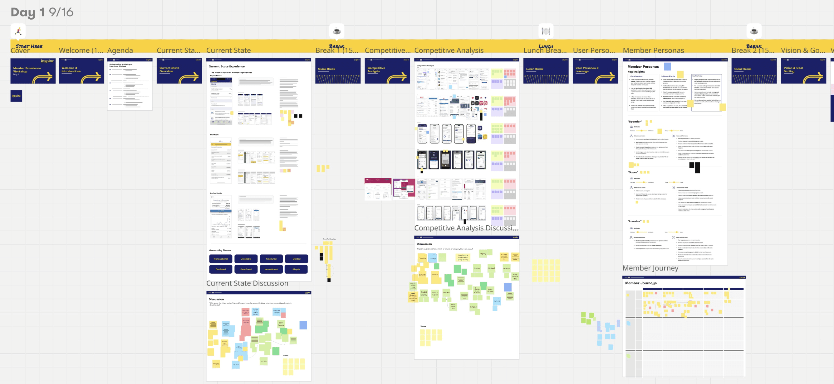 Miro board from our multi-day ideation workshop, where we led our client through understanding the current state of the industry and aligned on key user personas & journeys