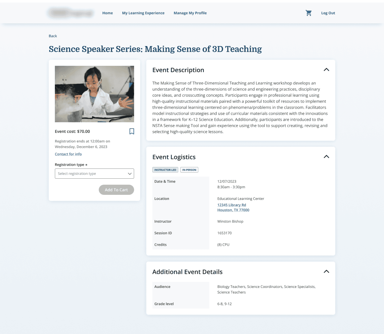Since the event description, event logistics, and additional event details sections can vary in length based on event, we incorporated a collapsible card option to make information less overwhelming