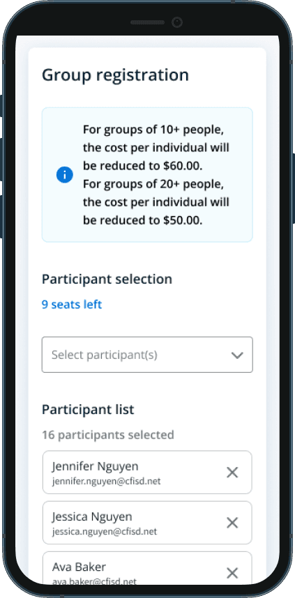 Additionally, we implemented different registration flows based on type: for example, for group registrations, users needed an easier way to select who they are registering for.
