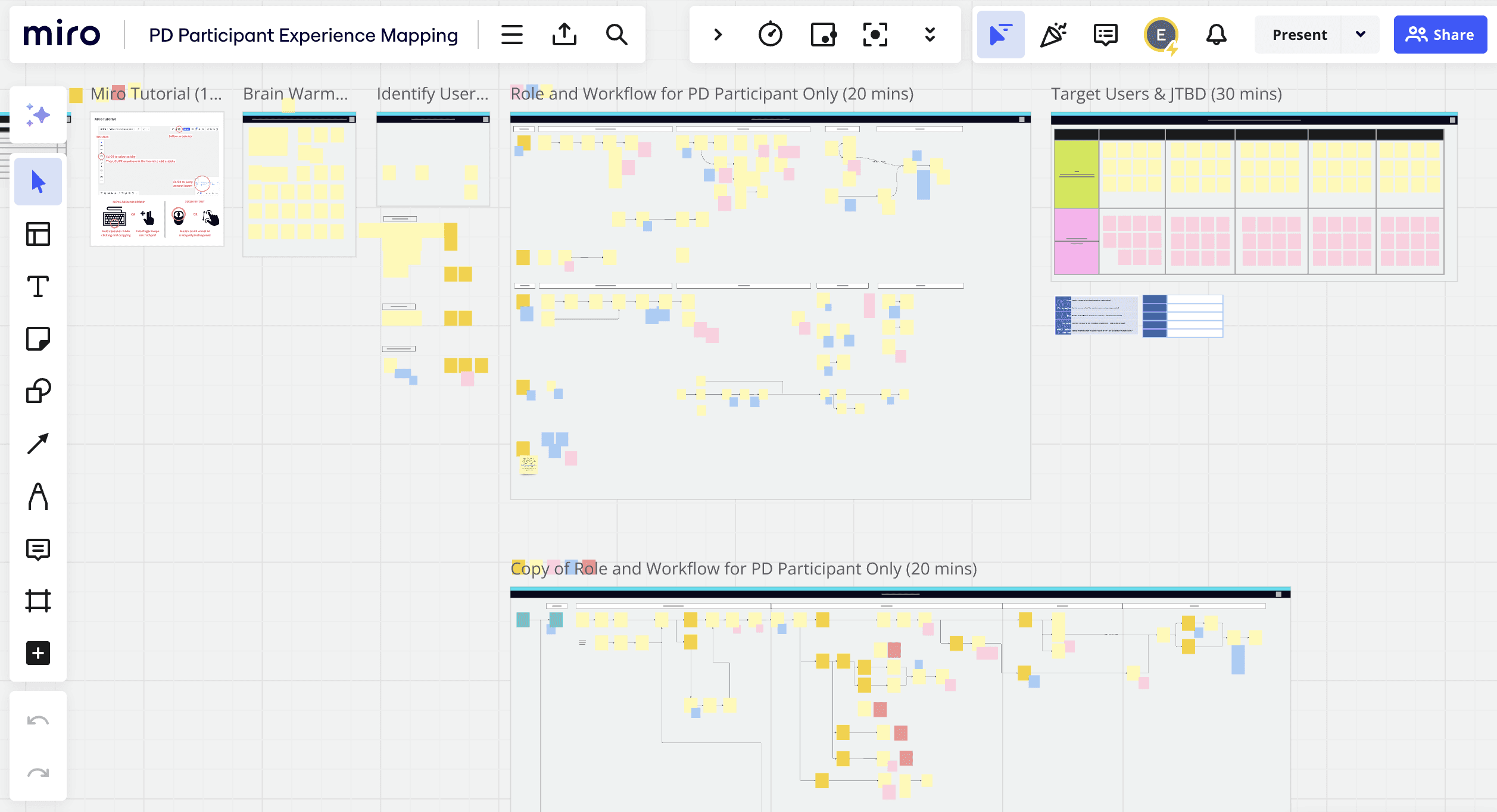 Miro board from an experience mapping session, where we talked with users about the participant experience of using the product to map out key features, flows, and pain points.