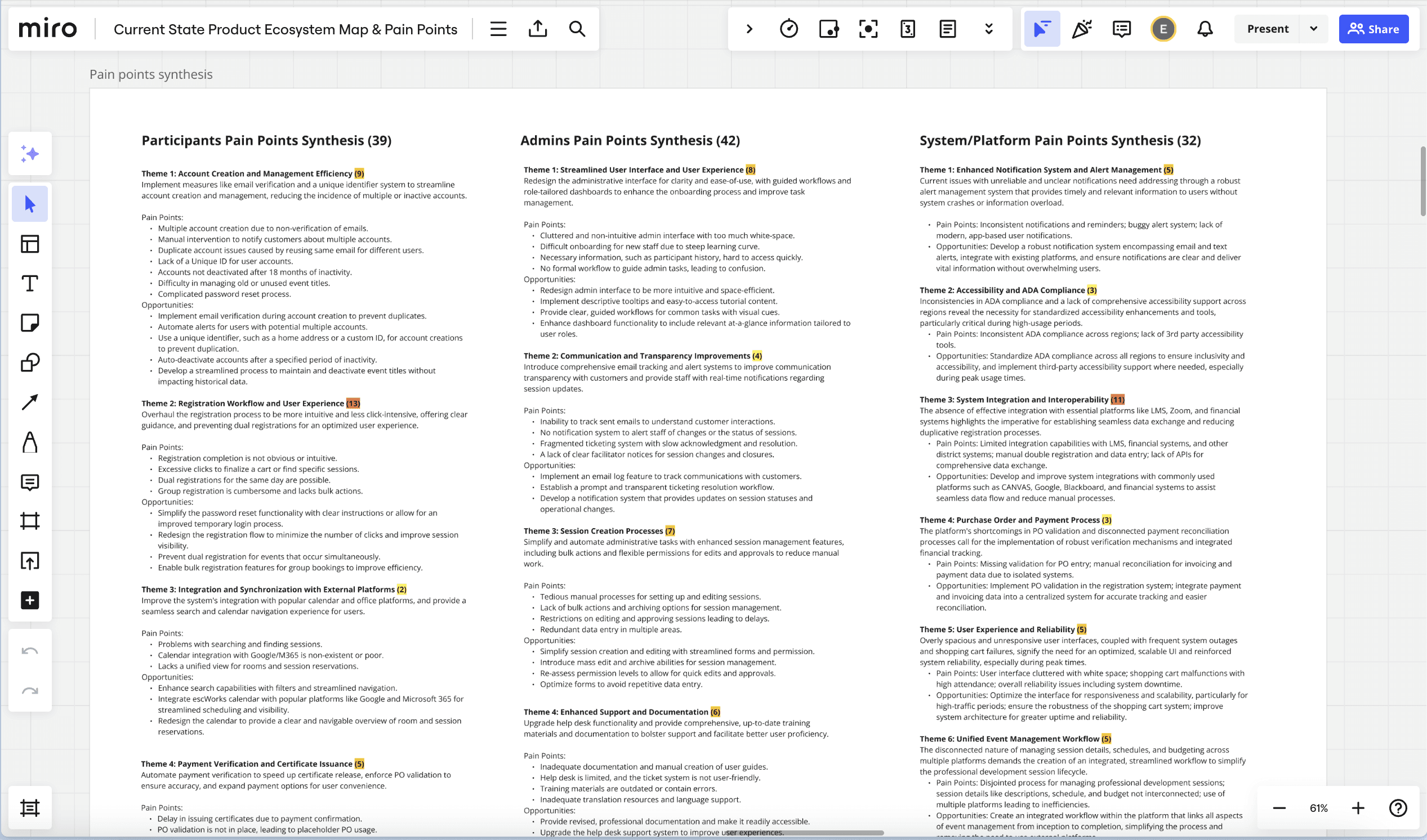 A snippet of the pain point synthesis, where I captured all of the pain points documented during workshop sessions to find themes and experiences that need the most attention based on the number of grievances mentioned.